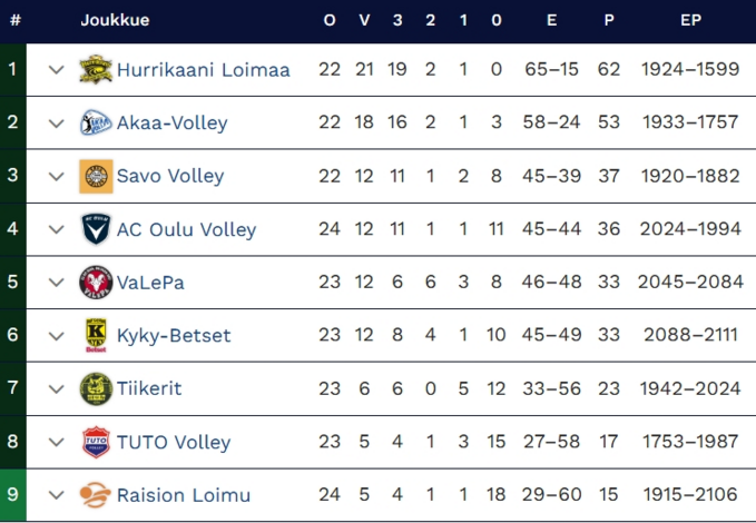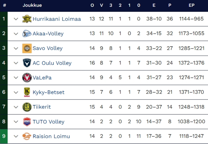 | Ti | 30.12.2025 | 18:30 | KyKy-Betset | - | Raision Loimu | 3-1 (20-25, 25-20, 25-18, 25-20) |