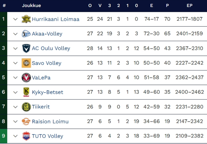 | La | 20.12.2025 | 17:00 | VaLePa | - | KyKy-Betset | 3-2 (25-23, 31-33, 27-29, 25-16, 15-12) |