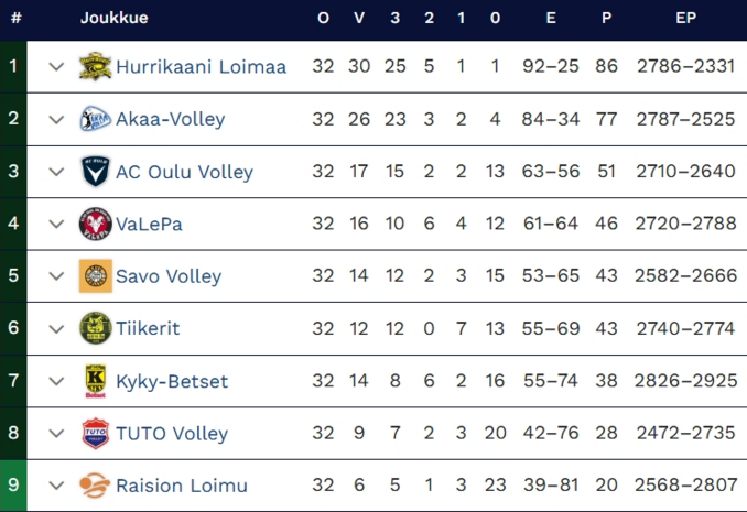 | La | 14.3.2026 | 17:00 | KyKy-Betset | - | Tiikerit | 3-2 (25-20, 25-19, 29-31, 16-25, 15-10) |