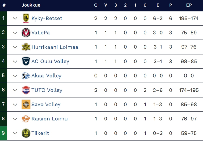 | Ke | 22.10.2025 | 18:30 | KyKy-Betset | - | TUTO Volley | 3-1 (25-22, 21-25, 25-22, 25-20) |