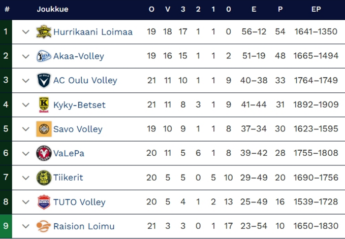 | Ti | 30.12.2025 | 18:30 | KyKy-Betset | - | Raision Loimu | 3-1 (20-25, 25-20, 25-18, 25-20) |