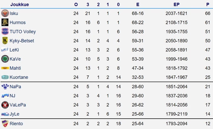 | Su | 24.3.2019 | 17:01 | Isku | - | KyKy-Betset | 0-1 (23-25) |