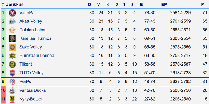 | Pe | 24.3.2023 | 18:30 | Vantaa Ducks | - | KyKy-Betset | 3-0 (25-17, 25-17, 25-14) |